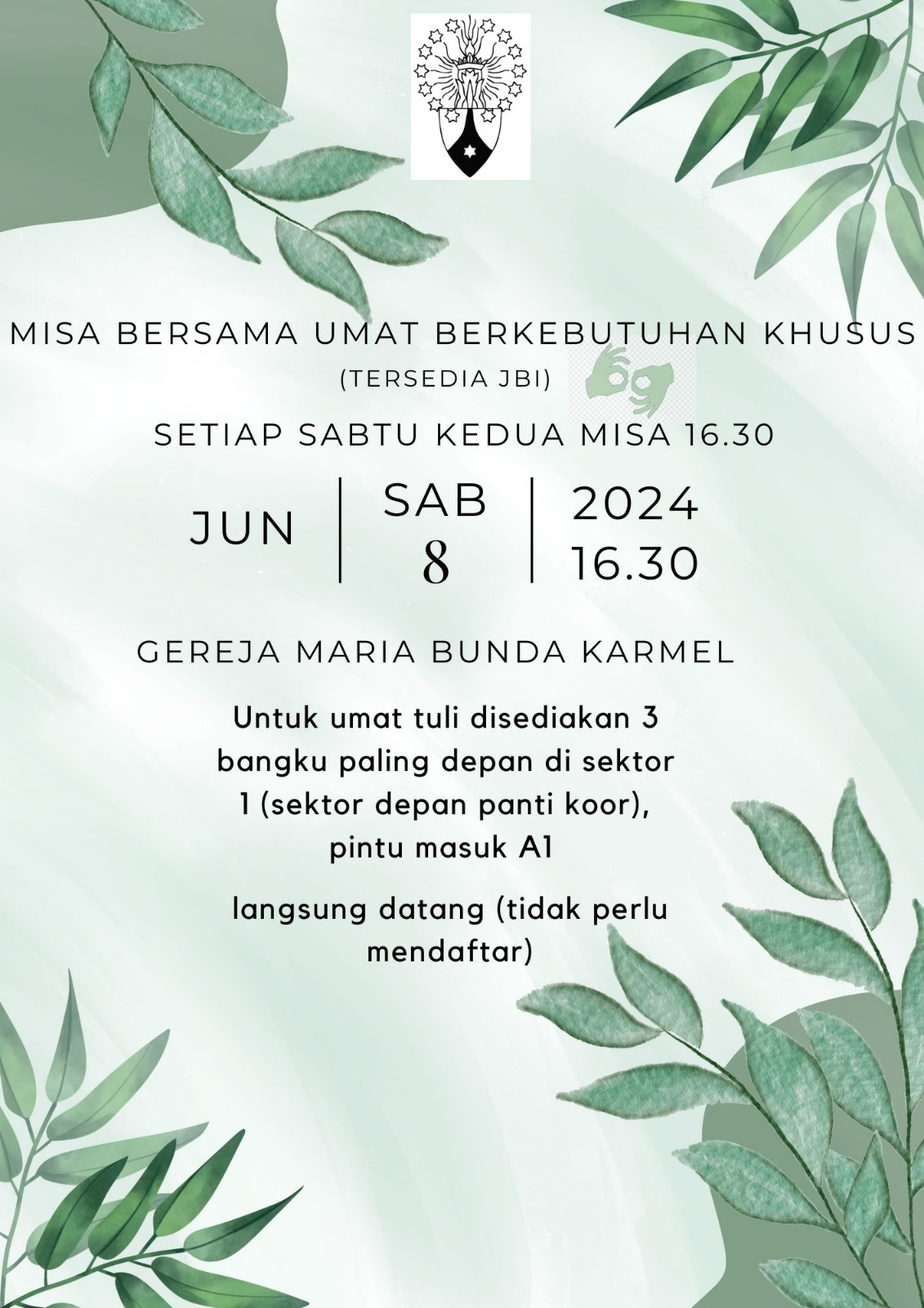 Bapak/Ibu yang menemani Umat Berkebutuhan Khusus dipersilahkan duduk di sektor 1 Tiga baris paling depan di sektor 1 mohon kesediaannya untuk diberikan kepada umat tuli agar dapat melihat JBI dengan jelas. Terima kasih
