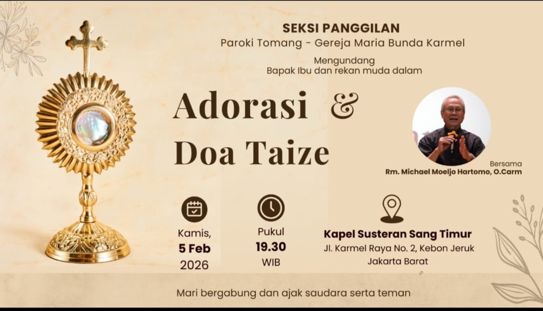 Seksi Panggilan Paroki Tomang – Gereja MBK mengundang Paguter, Bapak Ibu dan tekan muda untuk mengikuti Ibadat Taize dan Adorasi Sakramen Maha Kudus yang akan diadakan pada: