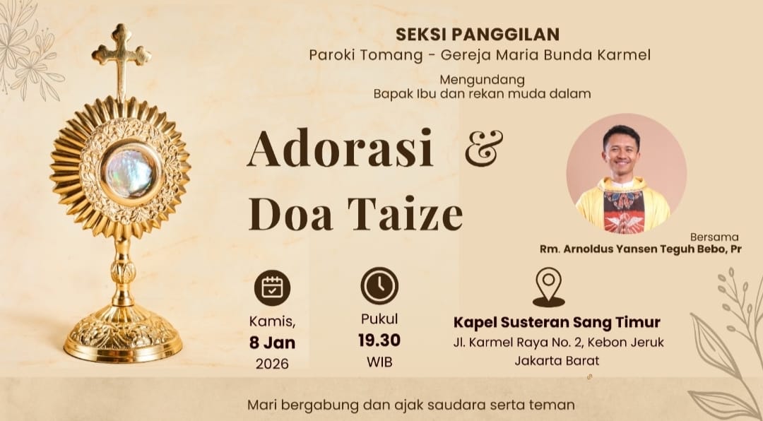Seksi Panggilan Paroki Tomang – Gereja MBK mengundang Paguter, Bapak Ibu dan rekan muda untuk mengikuti Doa Taize dan Adorasi Sakramen Maha Kudus yang akan diadakan pada: