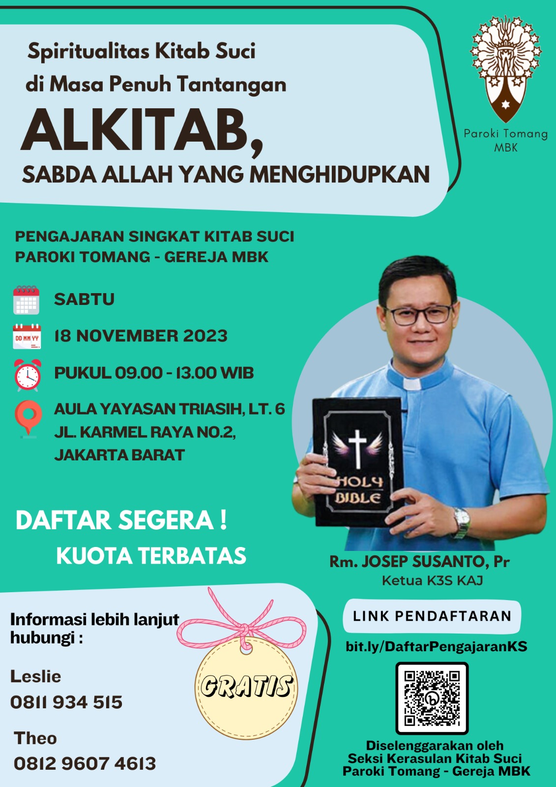 Bersama ini kami mengundang Umat Paroki Tomang untuk mengikuti Pengajaran Singkat Kitab Suci bersama Rm. Josep Susanto dengan tema: Spiritualitas Kitab Suci di Masa Penuh Tantangan: Alkitab, Sabda Allah yang Menghidupkan.