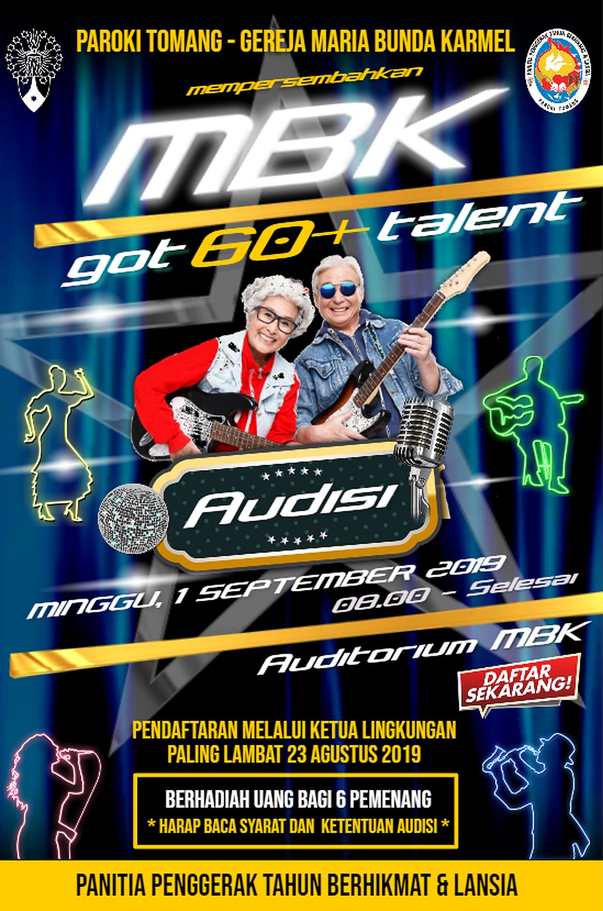 Kami mengundang para lansia MBK yang berusia 60 tahun atau lebih di tahun ini untuk mempertunjukkan bakat dan kemampuan anda di acara Audisi MBK GOT TALENT 60+ yang akan diadakan pada tgl 1 September 2019 di Auditorium. Pendaftaran ke Ketua Lingkungan masing-masing dan mohon memperhatian Syarat dan Ketentuan yang berlaku sebagai berikut: