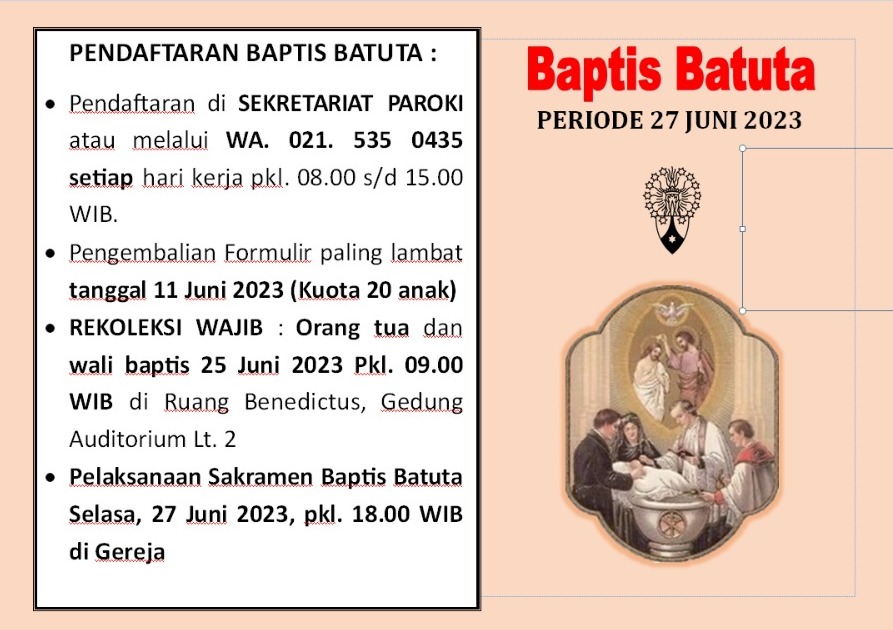 – Orang tua dan Wali baptis wajib mengikuti rekoleksi yang akan diadakan pada tanggal 25 Juni 2023 pk.09.00 di r. Benedictus, Auditorium lt.2.