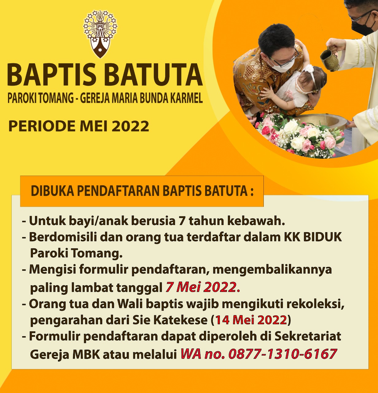Telah dibuka pendaftaran Baptis Batuta untuk periode baptis bulan Mei 2022 melalui Sekretariat Gereja MBK dengan ketentuan sbb :