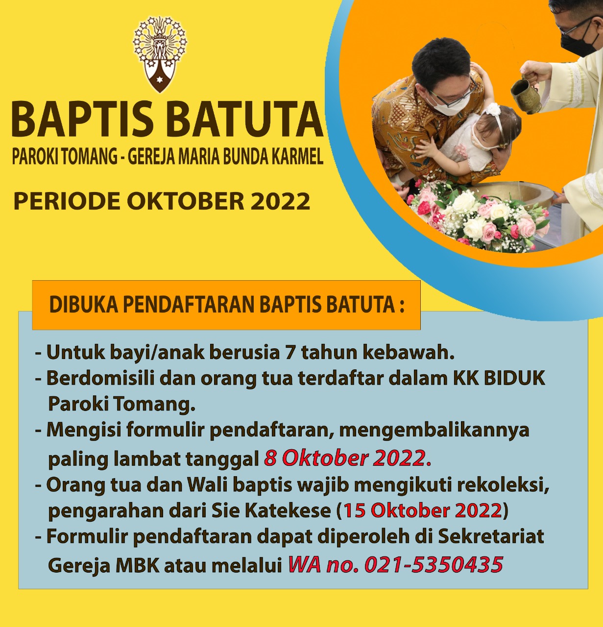 Telah dibuka pendaftaran Baptis Batuta untuk periode baptis bulan Oktober 2022 melalui Sekretariat Gereja MBK dengan ketentuan sbb :