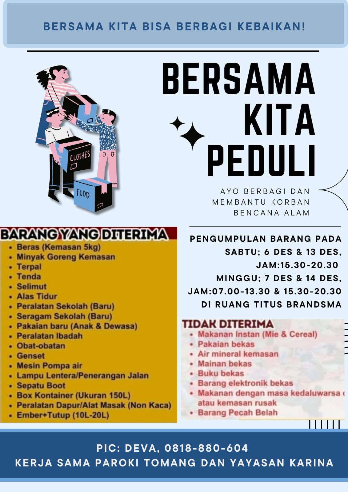 Saudara-saudari terkasih, PSE Paroki Tomang bekerja sama dengan Yayasan Karina menerima donasi berupa barang, seperti yang tercantum dalam flyer.