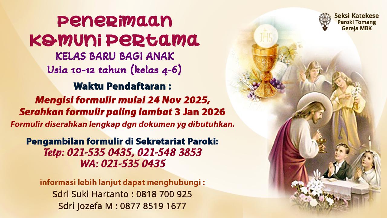Dengan ini diinformasikan pembukaan pendaftaran Sakramen Komuni Pertama. Pengajaran Sakramen Komuni Pertama akan diselenggarakan secara online atau tatap muka (offline).