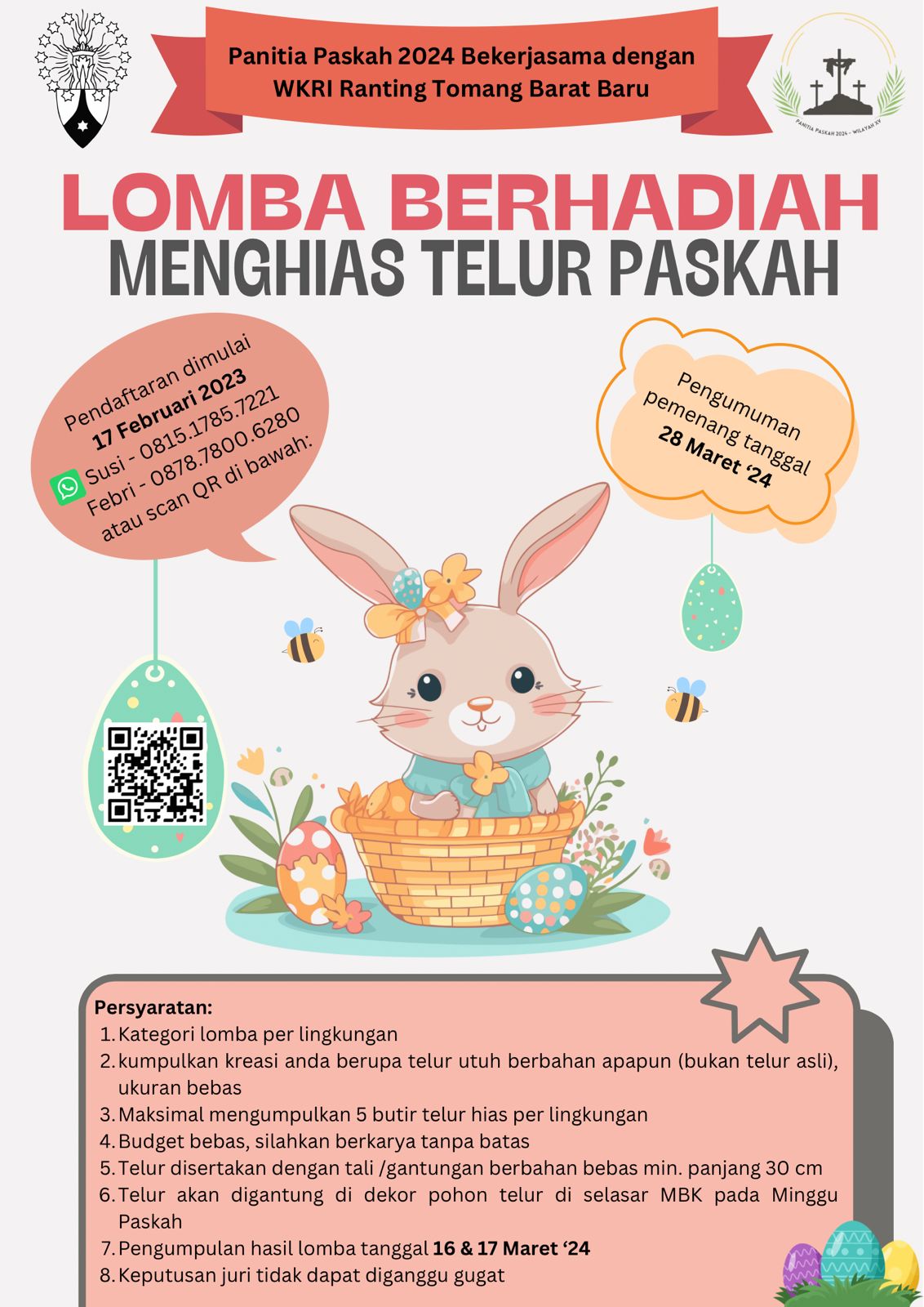 Panitia Paskah 2024 bersama dengan WKRI Ranting Tomang Barat Baru mengundang para umat di Paroki Tomang – Gereja Maria Bunda Karmel untuk turut serta berpartisipasi dalam LOMBA BERHADIAH MENGHIAS TELUR PASKAH.