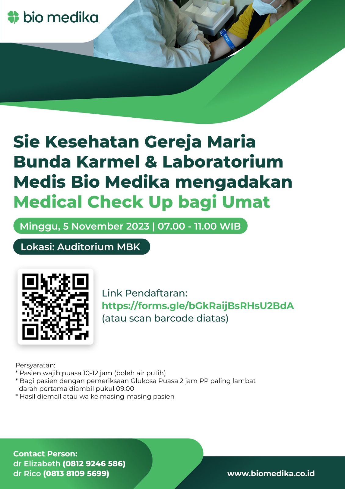Sie Kesehatan Gereja MBK bekerjasama dengan Laboratorium Medis Bio Medika, mengadakan MCU dengan harga spesial, yang akan dilakukan pada :