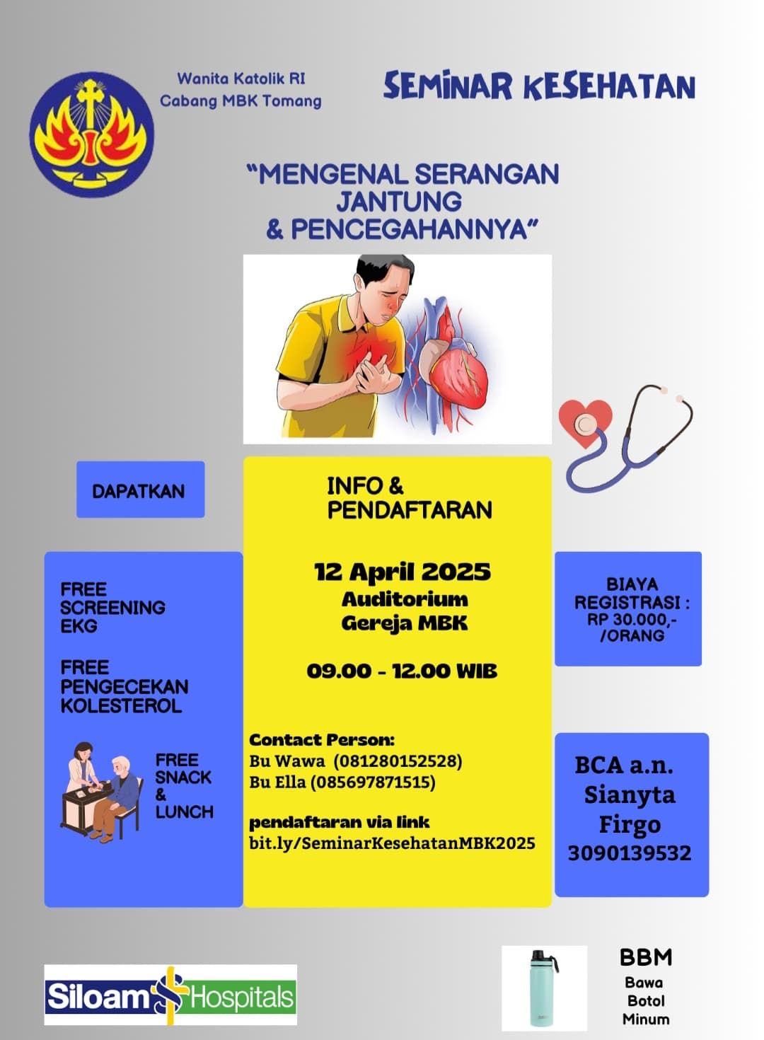WKRI Cabang MBK Paroki Tomang mengadakan Seminar Kesehatan bertema: “Serangan Jantung & Pencegahannya” yang akan diadakan pada :
