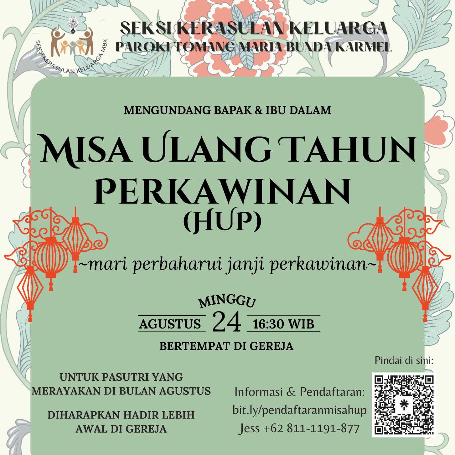 Seksi Kerasulan Keluarga Paroki Tomang – Gereja Maria Bunda Karmel, mengundang para PASUTRI yang merayakan Ulang Tahun Perkawinan di bulan Agustus 2025 untuk mengikuti Perayaan Ekaristi dengan intensi HUP pada: