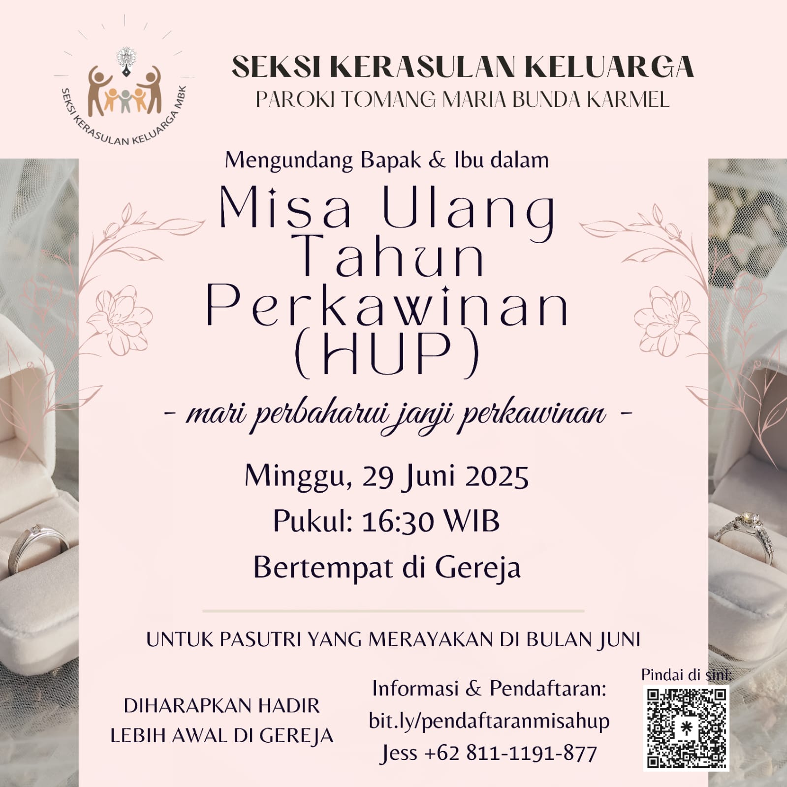 Seksi Kerasulan Keluarga Paroki Tomang – Gereja Maria Bunda Karmel, mengundang para PASUTRI yang merayakan Ulang Tahun Perkawinan di bulan Juni 2025 untuk mengikuti Perayaan Ekaristi dengan intensi HUP pada: