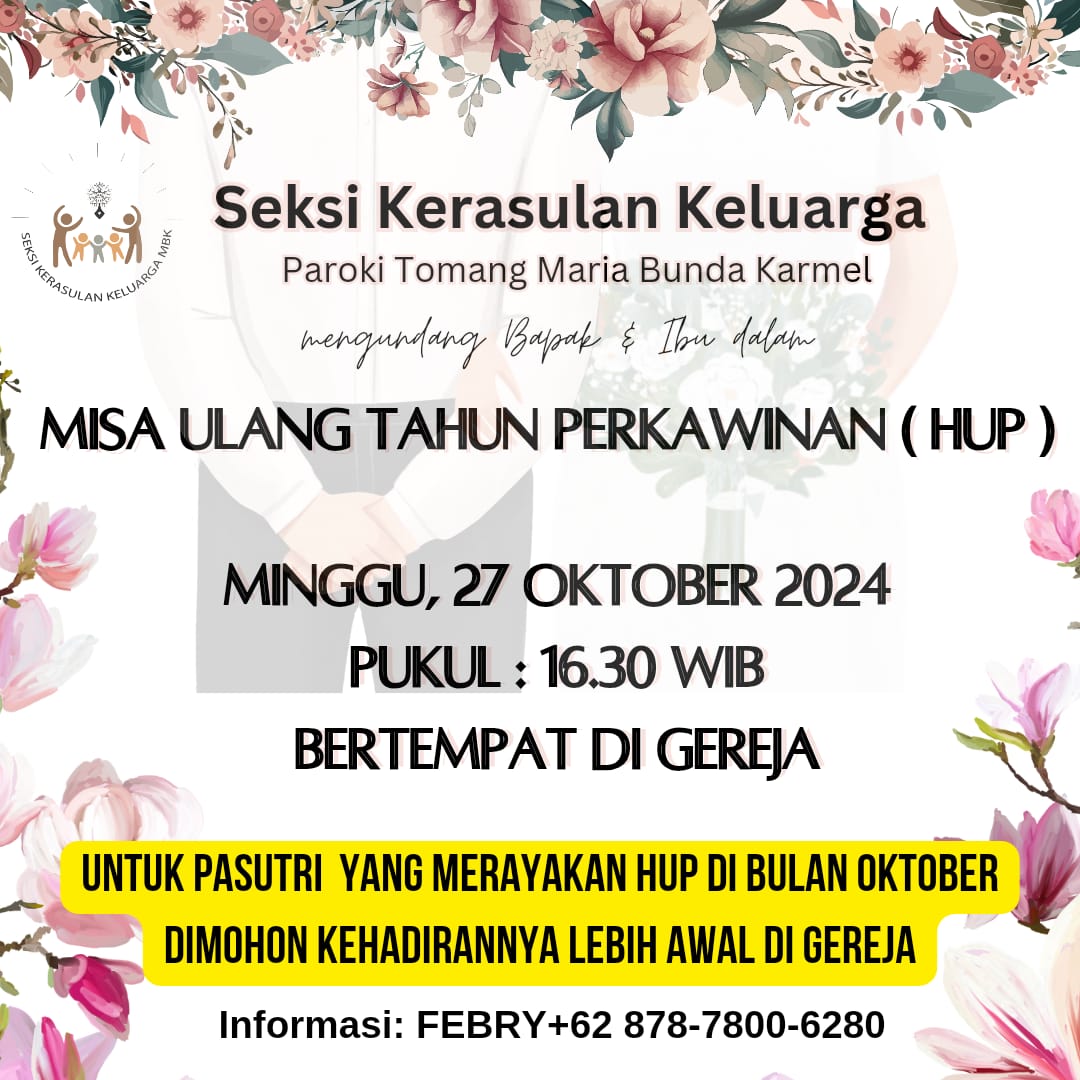 Seksi Kerasulan Keluarga Paroki Tomang – Gereja Maria Bunda Karmel, mengundang para PASUTRI yang merayakan Ulang Tahun Perkawinan di bulan Oktober 2024 untuk mengikuti Perayaan Ekaristi dengan intensi HUP pada: