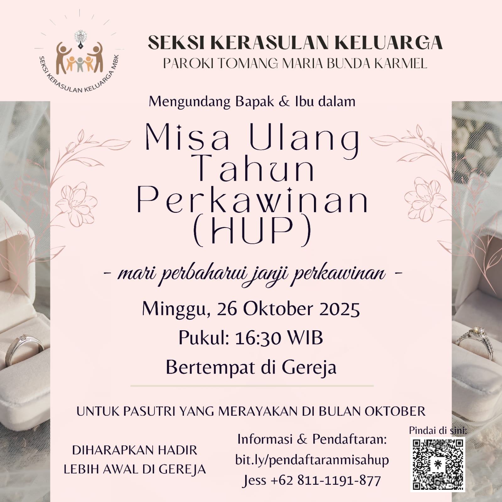 Seksi Kerasulan Keluarga Paroki Tomang – Gereja Maria Bunda Karmel, mengundang para PASUTRI yang merayakan Ulang Tahun Perkawinan di bulan Oktober 2025 untuk mengikuti Perayaan Ekaristi dengan intensi HUP pada: