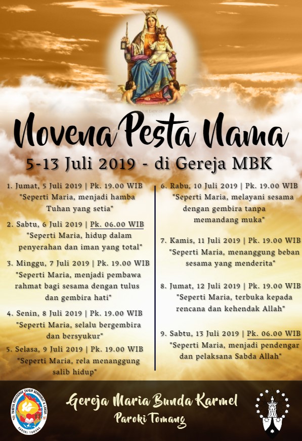 Misa Novena Pesta Nama MBK diadakan dari tgl 5 – 13 Juli 2019 mulai pukul 19.00 kecuali hari Sabtu, tgl 6 & 13 Juli 2019 mulai pukul 06.00 pagi.