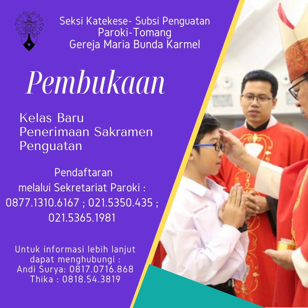 Dengan ini diinformasikan Pembukaan Pendaftaran Sakramen Penguatan. Pengajaran Sakramen Penguatan akan diselenggarakan secara online atau tatap muka (offline). Pendaftaran melalui Sekretariat Paroki : 0877 1310 6167; 021 5350435; 021 53651981