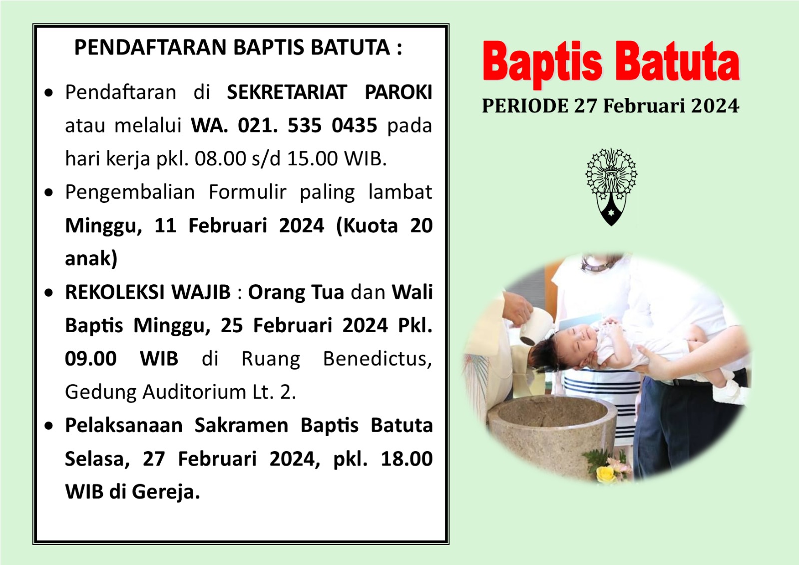 – Orang tua dan Wali baptis wajib mengikuti rekoleksi yang akan diadakan pada tanggal 25 Februari 2024 pk.09.00 di r. Benediktus.