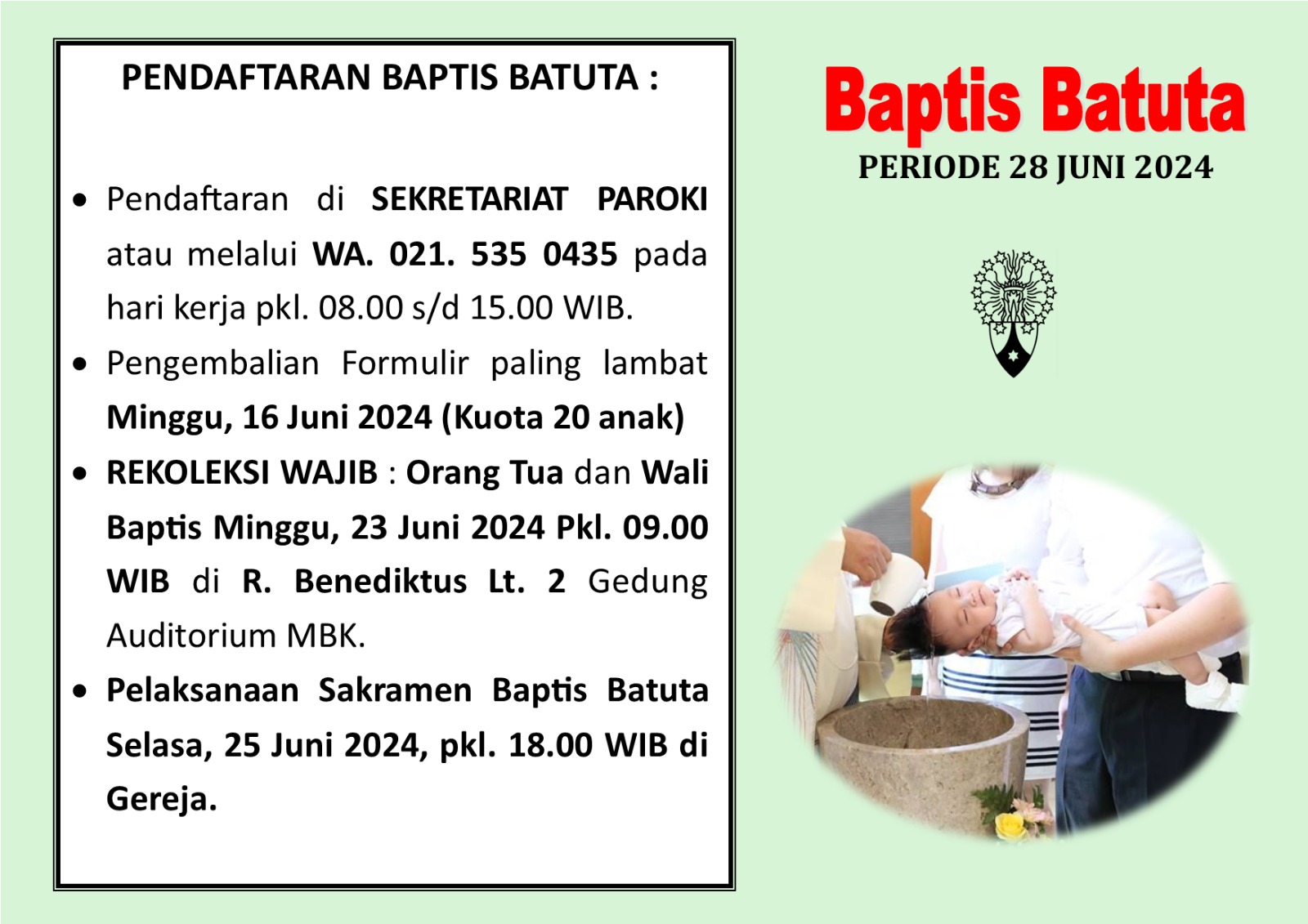 Telah dibuka pendaftaran Baptis Batuta untuk periode baptis 28 Juni 2024 dengan ketentuan sbb :