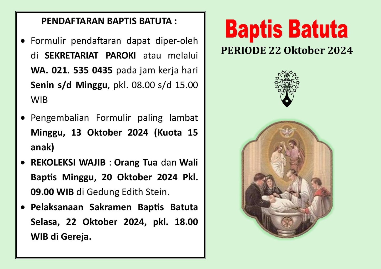 – Orang tua dan Wali baptis wajib mengikuti rekoleksi yang akan diadakan pada tanggal 20 Oktober 2024 pk.09.00 di Gedung Edith Stein.