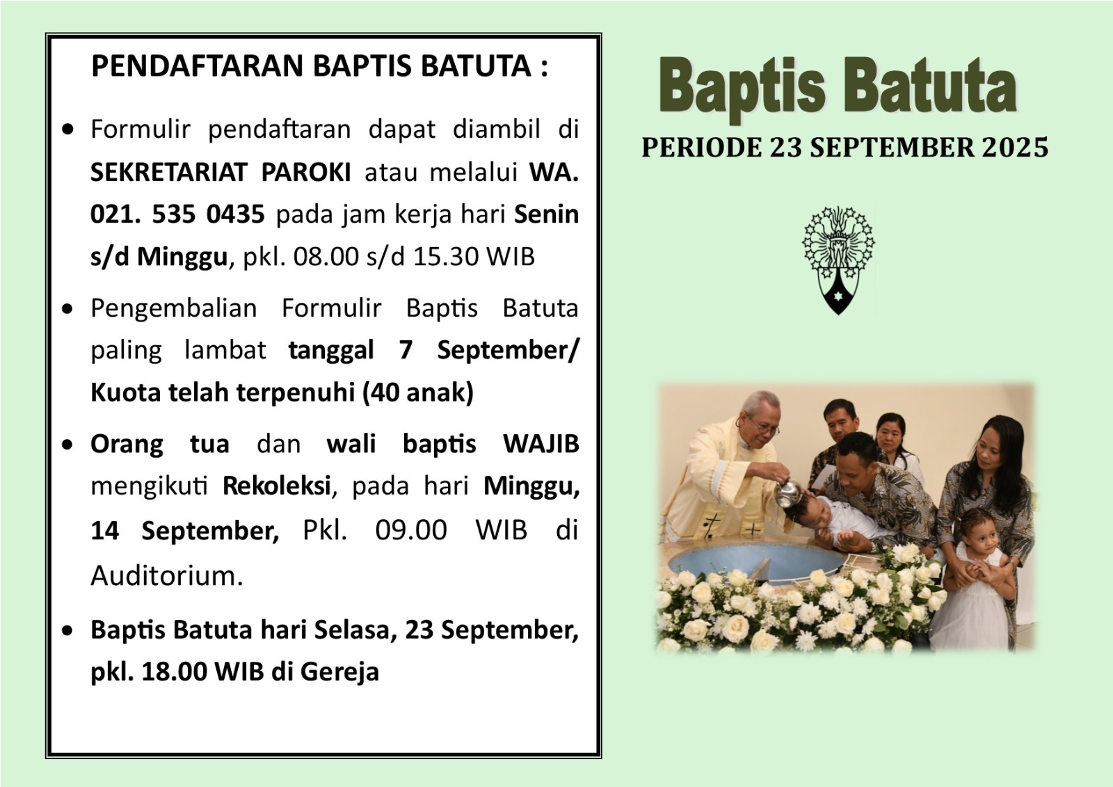 Telah dibuka pendaftaran Baptis Batuta untuk periode baptis 23 September 2025 dengan ketentuan sbb :