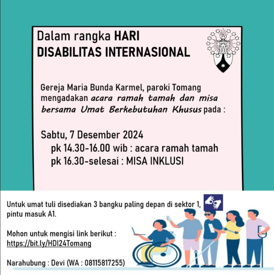 dalam rangka merayakan Hari Disabilitas Internasional, TSBP3 Paroki Tomang bekerja sama dengan Sie Kerasulan Keluarga & Yayasan Triasih mengundang untuk hadir dalam acara ramah tamah dilanjutkan dengan Misa Inklusi sebagai berikut :