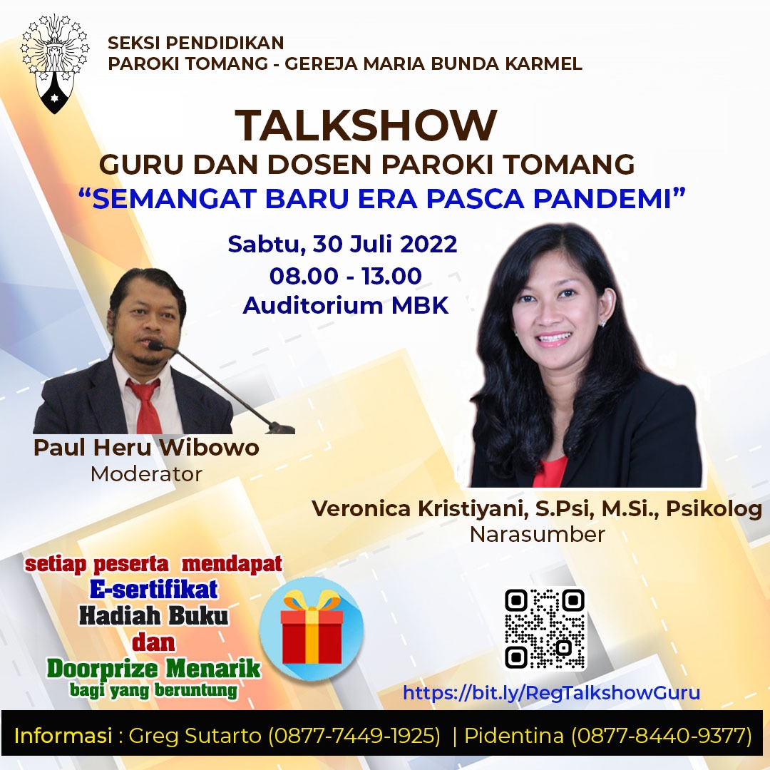 Bersama ini, kami dari Seksi Pendidikan Paroki Tomang Gereja Maria Bunda Karmel mengajak para guru dan dosen untuk mengikuti Talkshow Semangat Baru Era Pasca Pandemi yang akan dilaksanakan pada: