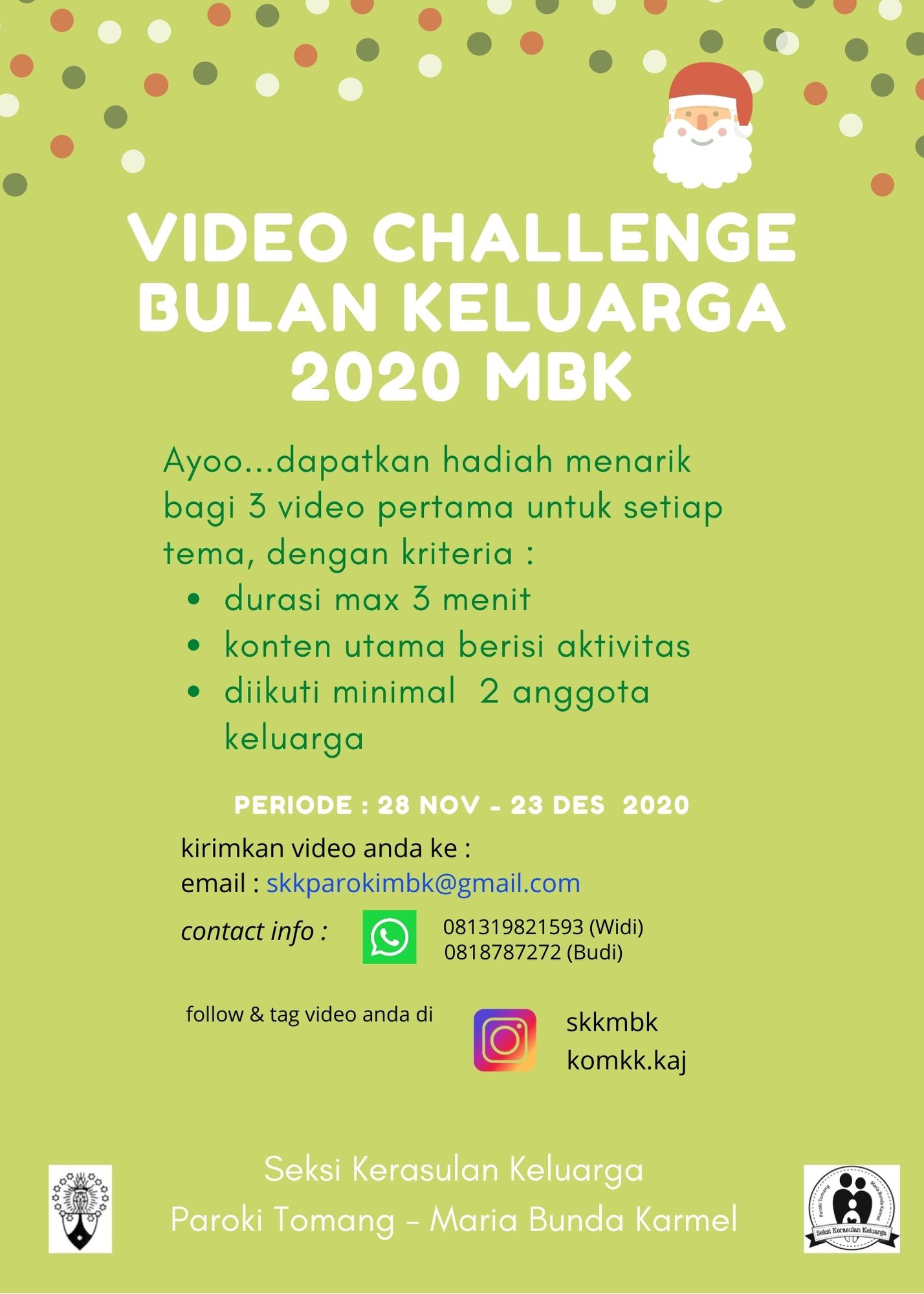 - Bagi keluarga yang beraktivitas mandiri, dapat merekam dan kemudian mengirimkan video kepada tim SKK (terbuka untuk umat MBK) #